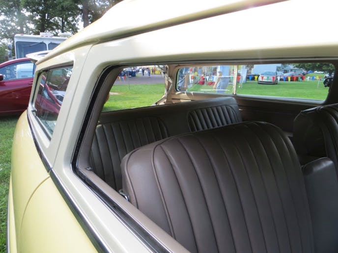 Inside, a tilt column was pirated from a ’74 Chevy van and topped with an Impala steering wheel. The front seat is from a ’65 Buick Electra, the rear seat is out of a ’56 Ford station wagon and both are covered in Kalfskin Beige leather.
