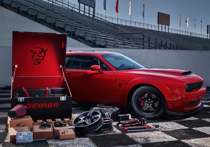 - Demon Crate ($1): Exclusive Demon Crate offers components that unleash the car’s 840 horsepower, 770 lb.-ft. of torque and full potential at the drag strip and is personalized with the buyer’s name, VIN and serial number. The Demon Crate and the performance parts it holds are valued at $6,140, but Challenger SRT Demon owners can buy the entire package for $1. Contents of the Demon Crate include: