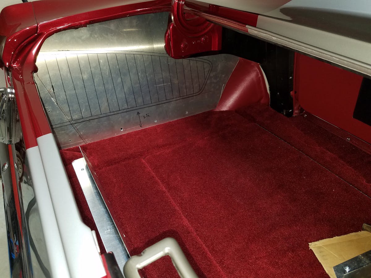 Doug fabricated a flat trunk floor with a hinged center for access to the fuel tank sending unit and EFI in-tank pump. The trunk floor was wrapped in cut loop carpet set off by custom panels all around the trunk, which mimic the interior door panels.