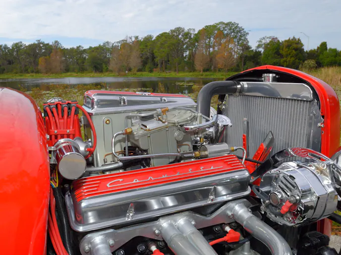 Today, the little red hot rod is essentially identical to the way it was when it was built in 1965. The car still sits on the same 1932 stock Ford frame with a 3-inch drop, straight axle, and leaf spring rear suspension.