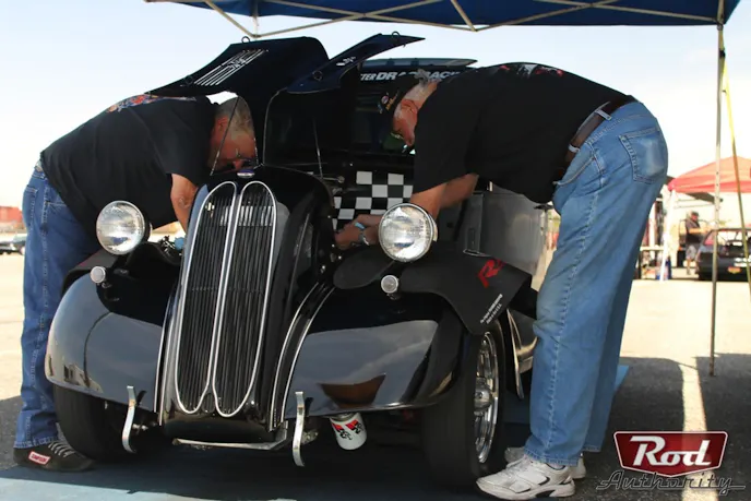Ron has been racing in the Hot Rod Heritage series and at Goodguys since 2003 so he’s no stranger to the blacktop. As the interview went on, a calm breeze turned into a pretty noticeable tailwind that put a little spark in Ron’s eye. We asked him to elaborate on why the wind is such a factor especially for a vehicle with a body profile such as his ’51. “On a car like this, it’s hard to deal with. This car has got a lot of flat area in the back and it’s tall unlike a lot of newer cars that are more streamlined. The wind affects this car a lot and it’ll pick up 2 mph easily if the breeze is blowing.”