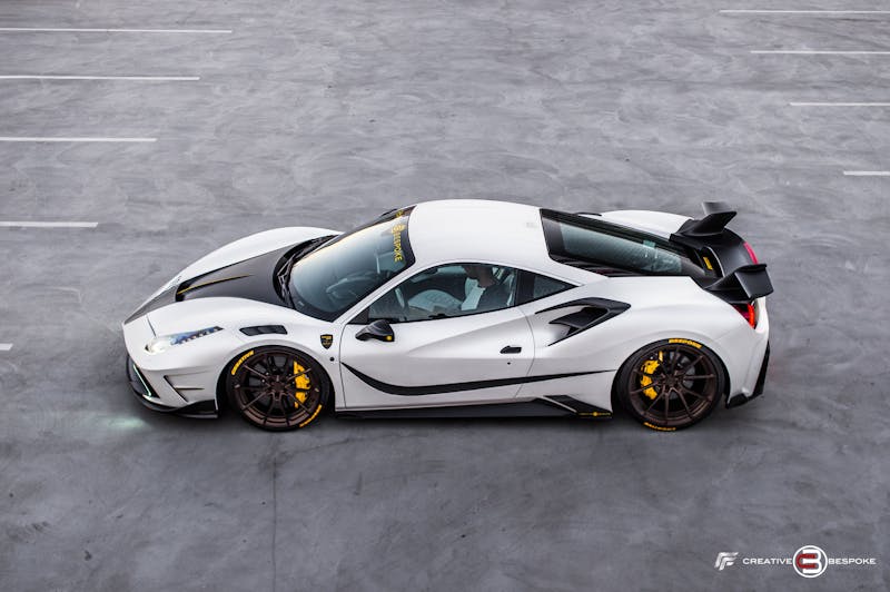 Inside the 4XX comes with a full custom interior imagined by Creative Bespoke with the Mansory carbon package which features the “fingers” inspired by the 458 Speciale interior. The seats are upholstered in White, diamond stitched Leather with yellow alcantara through the seats. The doormats have been embroidered with the “Creative Bespoke” touch.