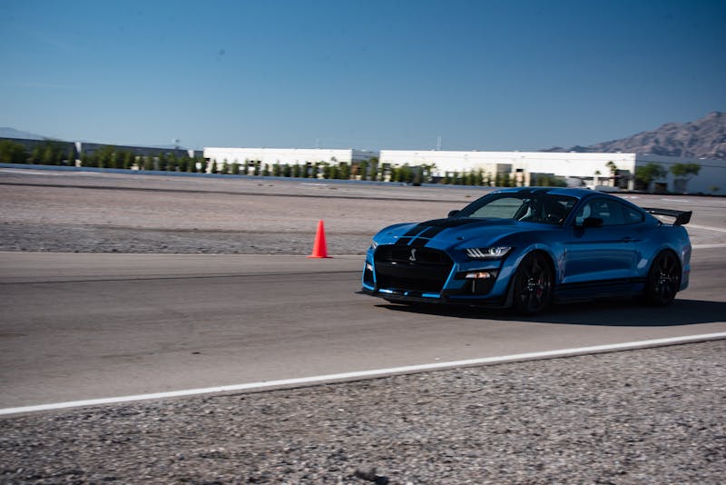 Several 2020 Ford Mustang Shelby GT500s were set up with roll bars/harness bars for the track testing portions of the media event. Each was fitted with a six-point harness as well. LVMS is a long, technical course with plenty of sweeping turns, a decreasing radius turn, and a chicane.