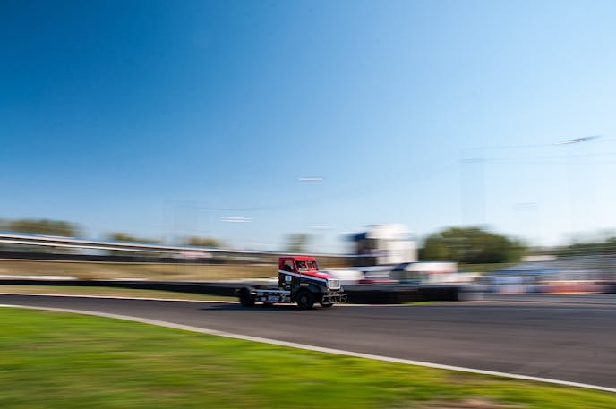 After several laps of tail-out fun and a quick check of my mirrors, I could see that I was half of a lap behind one set of trucks and the same distance in front of the other, so it was more of a self-test to see just how far I could hold the No. 11 truck sideways on the back straight, and just how far I could power out of turn 12 headed onto the main straight and then what, wait, huh, oh you gotta be kidding me!