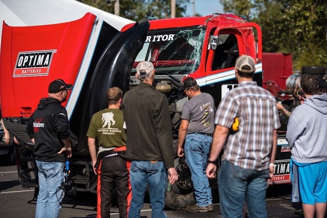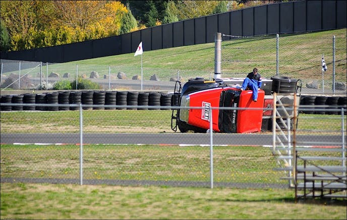 “Did that really just happen? Did I just do the one thing they told me NOT to do?,” I thought to myself. “F^%#, f^%# and f^%#” is about all I could come up with as I unbelted myself and took the submarine-style exit from the truck as the safety crews arrived. After a quick check from the EMTs, the truck was rolled back onto its wheels and into my paddock. I sat there mostly trying to calm my wife who was in a justified panic, not being able see either the wreck or myself coming back in the No. 11. So, that’s it, the weekend is over, trucks done, right? Wrong.