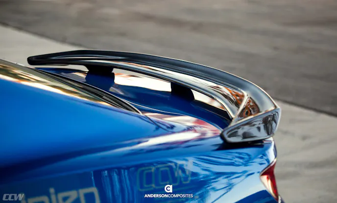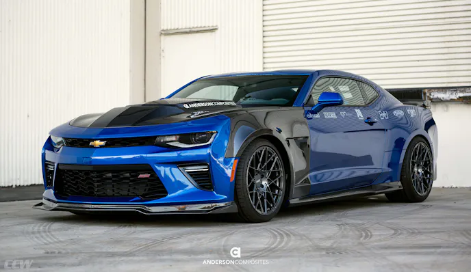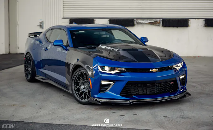 Clad in the latest carbon fiber aero kit created by Anderson Composites, this Hyper Blue Camaro SS performs as good as it looks. It features a carbon fiber hood, chin spoiler, rocker panels, front and rear fenders, rear spoiler, and a rear valance. These components enhance the Camaro’s aggressive styling while saving some weight and adding downforce.