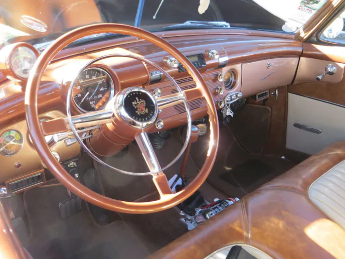 The dash was repainted in the new body color. Column is ididit and the stock wheel was adapted to it.