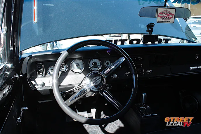 Inside the trunk is a custom display of sub boxes and amplifier racks to house the sound system, and Al’s Liner is used to reduce the heat and the road noise throughout the car, topcoated with Scorpion Protective Coatings. The electrical work was handled by Painless Wiring, and finishing off the dash is an Ididit tilt steering column and Con2R laser engraved steering wheel.