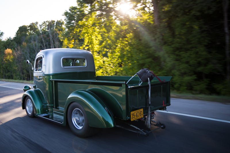 Weston hand-built the pickup’s box, aside from the ’50 Ford tailgate and front panel. The license plate frame plays peek-a-boo under the bed at the push of a button. The truck’s rear reveals Weston’s need for speed. Wide meats, a chute, and wheelie bars are on display, but only two of the three are used, at least for now. “The parachute is functional, but the wheelie bars are all fantasy,” Weston joked. Don’t take that the wrong way, blipping the Ford’s throttle throws people back in the seat, and it turns nasty burnouts.