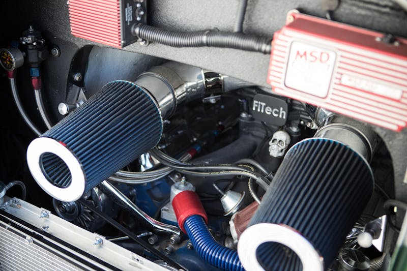 The custom-ground hydraulic camshaft with a .562” lift, 308 duration, 108-degree lobe separation, and 30-degrees of overlap was teamed with stage 2 1.7 ratio rockers to give the V-8 a healthy heartbeat soundtrack. Tom pillaged the MSD parts catalog for all his ignition needs, and a FiTech’s 800-hp fuel injection system replaces the old Demon carb on this thirsty 570hp motor.