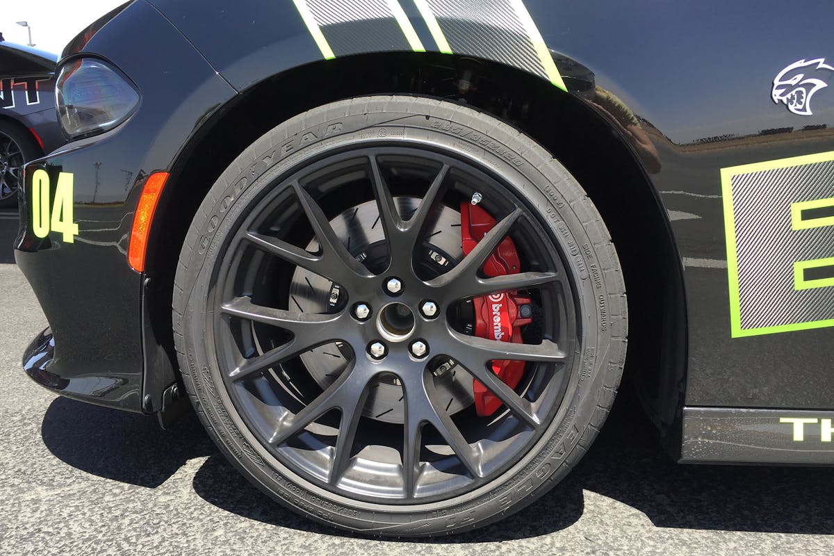 Our cars were all identically equipped 8-speed Challenger SRT 392s which differed from factory stock only in their use of race-style brake pads, which are very noisy but more resistant to brake fade, and Goodyear F1 tires, which are provided to the Bondurant school as part of Goodyear’s sponsorship.