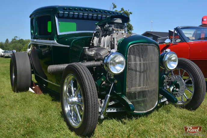 Backing the uniquely cooled blown V8 is a 700R4 automatic transmission built by Automatic Transmission Design, with gears selection done using a classic Lokar shifter topped with a custom green and white marble shift knob. Out back, the Ford is equipped with a Ford 9-inch rearend.