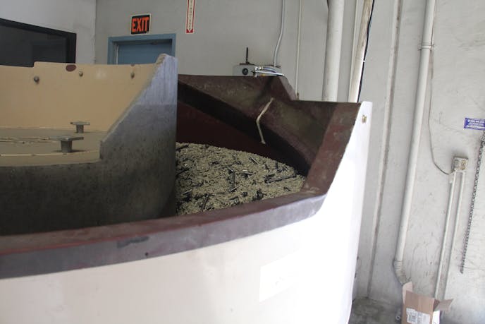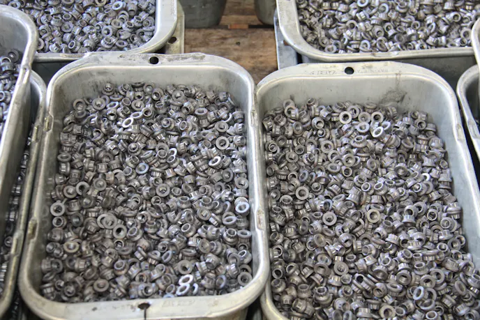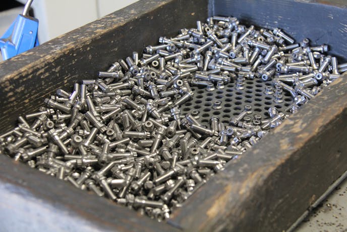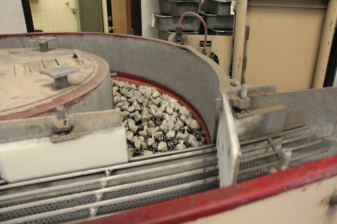 The fasteners are taken to a noisy, and segregated, part of the plant where they are polished in large vibratory tumblers filled with various abrasive media. These tumblers debur the un-machined fasteners, and polish the stainless steel ones.