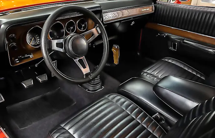 Inside, things were spartan and functional, with the entire interior borrowed from the higher Charger 500 trim level. “Rallye” instrumentation, an option on many of the brand’s performance cars such as the Challenger, was standard on the Super Bee and consisted of two large-face gauges flanked on the right by two smaller ones. Faux wood paneling, high-back bucket seats, a tilt wheel, cruise control, power windows, a choice of radios, and a center console were some optional interior niceties. A handful of interior colors were available.
