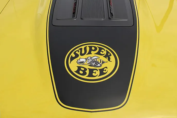 A blacked-out center hood bulge had a large, round Super Bee logo on the leading end, and black stripes extended from the base of the windshield to wrap around the sides of the car, where they ended at the trailing end of the rear fenders.