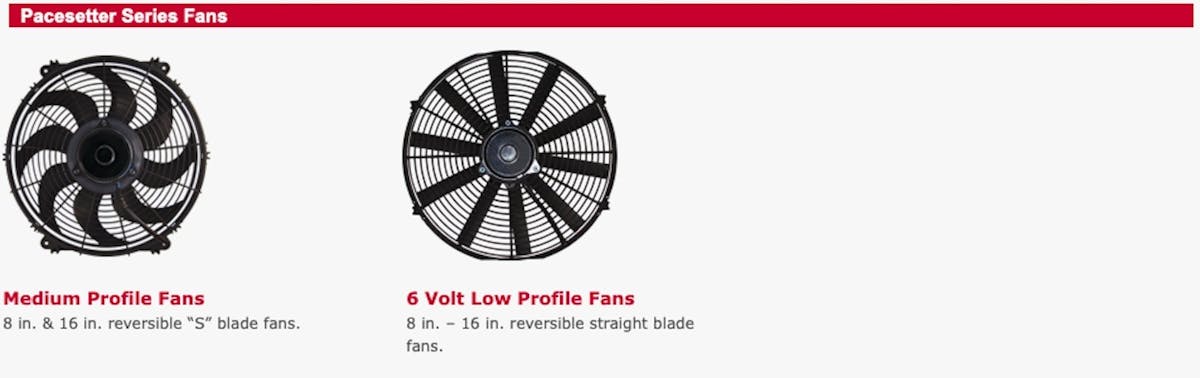 The Pacesetter Series fans are medium profile fans, available in 10-inch to 16-inch fan sizes. Designed to improve engine cooling, horsepower, and A/C cooling at idle, the Pacesetter Series fans feature a quiet, reversible S-blade design that eliminates vibration contact and increases airflow. The push-pull fans also have closed motors that are dust and water-resistant.