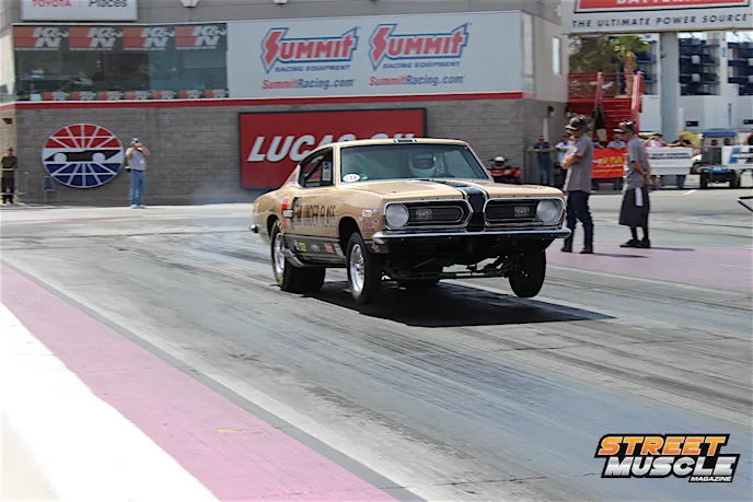Jay stated that it’s been on his bucket list since those days when he first watched Bob put the Barracuda up on the rear bumper. Jay asked Bob to take him for a ride, and Bob obliged him (and who wouldn’t?) and they headed out to Irwindale to pull a couple of wheelstands in the infield area of the circle track.
