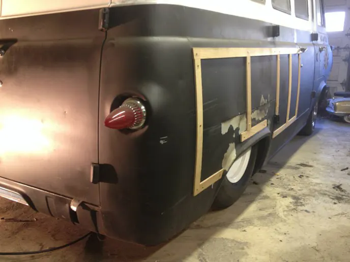 Brian modified SlammedHam to match the Scoobyvan that tows it. That means he had to shorten its length and height. After removing the siding and inner plywood, he laid the siding out on new sheets of plywood and had his best helper trace the siding onto the plywood. Brian then shortened the trailer by ten inches and lowered the roof by five inches, using the outline his sons Max and Myles drew as a template. He then cut the plywood for the sides and tacked them up to the metal frame ribs he welded in.