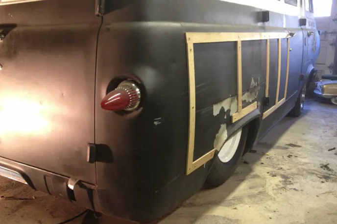 Brian modified SlammedHam to match the Scoobyvan that tows it. That means he had to shorten its length and height. After removing the siding and inner plywood, he laid the siding out on new sheets of plywood and had his best helper trace the siding onto the plywood. Brian then shortened the trailer by ten inches and lowered the roof by five inches, using the outline his sons Max and Myles drew as a template. He then cut the plywood for the sides and tacked them up to the metal frame ribs he welded in.