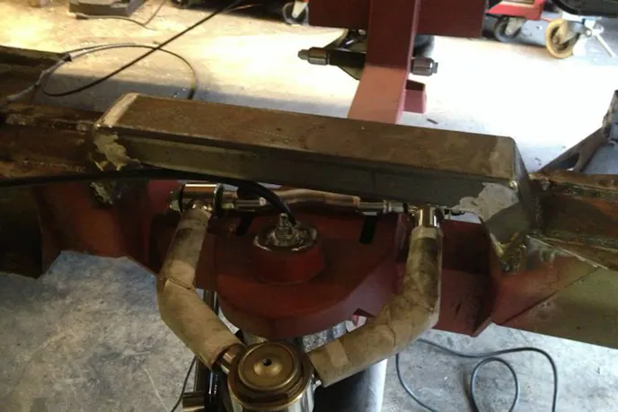 Since the steering rack is mounted behind the driver, Brian had to use a steering column reverser box( Actually a steering gearbox from a 95 Isuzu Trooper), and then mount the steering rack upside down so everything would mate up properly. This required cutting the old mounts off and fabricating new ones from scratch. Yes, there were a couple of Borgeson universal/swivel joints that he had to use also.