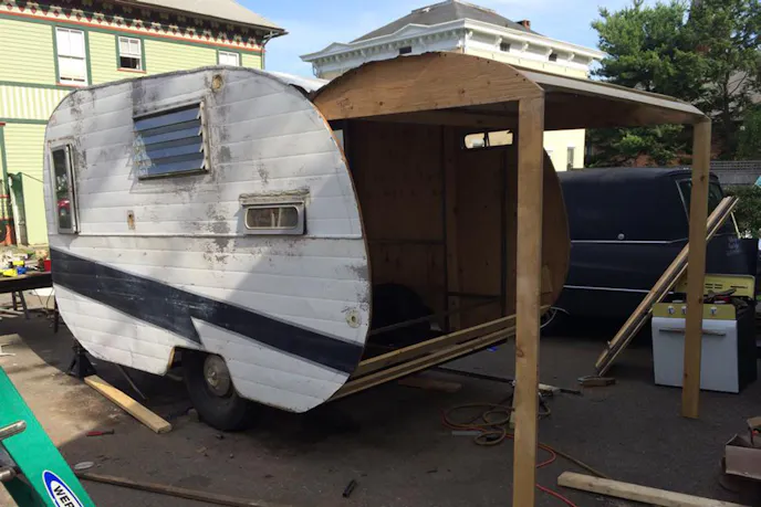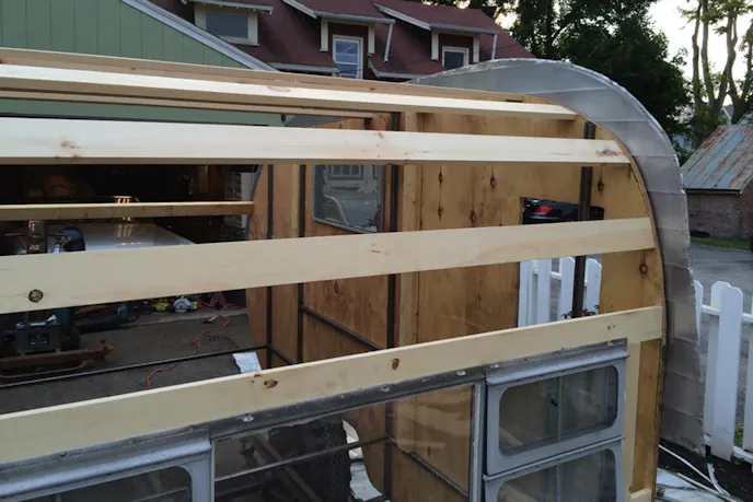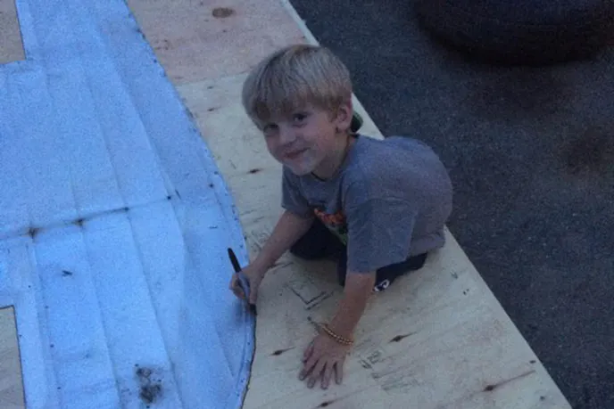 Brian modified SlammedHam to match the Scoobyvan that tows it. That means he had to shorten its length and height. After removing the siding and inner plywood, he laid the siding out on new sheets of plywood and had his best helper trace the siding onto the plywood. Brian then shortened the trailer by ten inches and lowered the roof by five inches, using the outline his sons Max and Myles drew as a template. He then cut the plywood for the sides and tacked them up to the metal frame ribs he welded in.