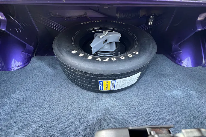 This was in June of ’84. It was originally a 340 ’Cuda with the Performance/twin-scoop factory hood, and it was EF8 Ivy Green Metallic with a black interior. Options included air conditioning and a 727 TorqueFlite automatic, and it had a 3.23 Sure Grip out back. It was still wearing its original F70-14 Goodyear Polyglas tires, one of which remains in the trunk for a spare.