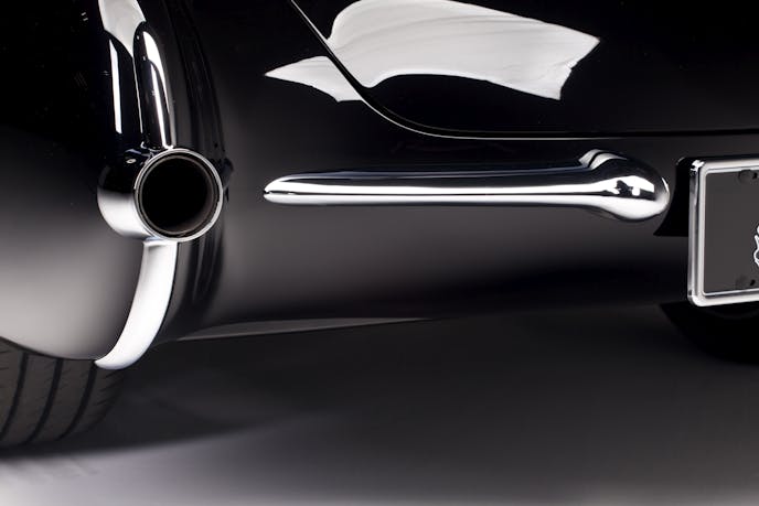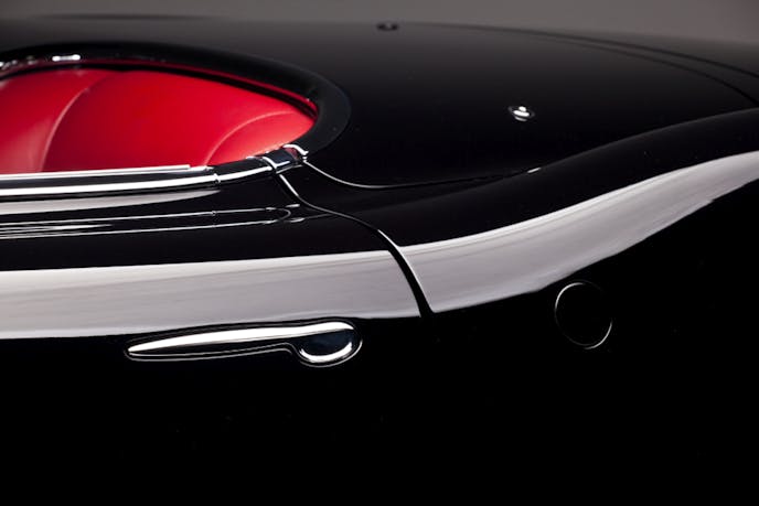 They started by making sure the 61 year old fiberglass body was brought up to snuff. They grafted on a new front clip, passenger rear quarter and lower valance, then tucked in the bumpers, and added Kindig’s signature custom door handles. A keen eye will notice laser straight bodywork and tight cut lines of tonneau compartment, doors, hood and trunk as well.