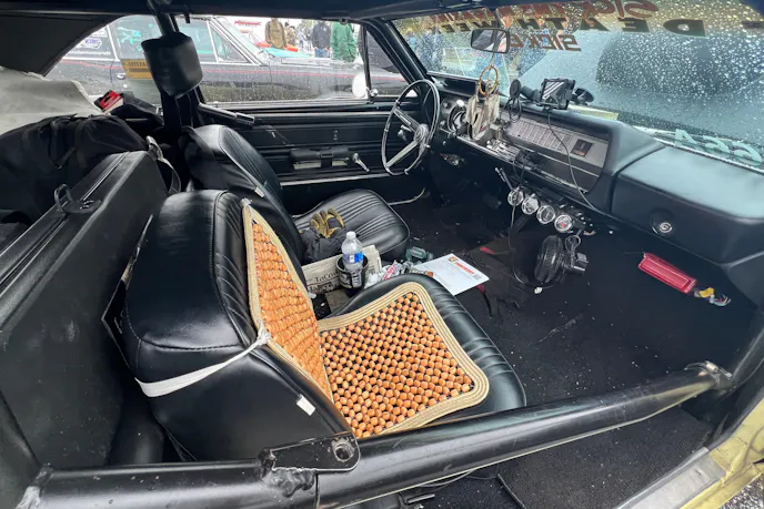 The interior, like that in many drag and drive entries, eschews luxury accoutrements. Air conditioning consists of rolling down the windows by hand and turning on a fan mounted to the dash. The stock three-spoke steering wheels still looks great after all these years, and an ET-appropriate roll cage with swing-out bars keeps him safe on track — just in case. Aftermarket gauges abound.