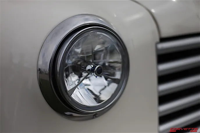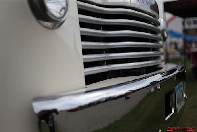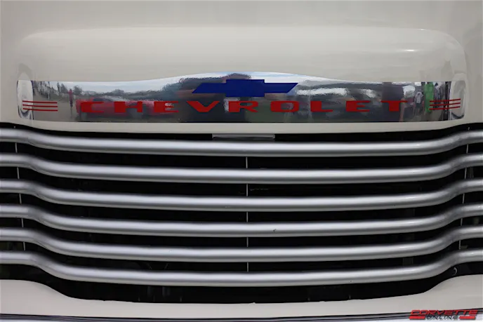 Finally the truck was sprayed Ermine white to match the Corvette, and like its little sister the bright-work was refinished to a proper luster, including the custom bumper, and custom grill which were needed because the factory components were also 15-inches too narrow.