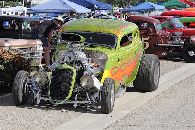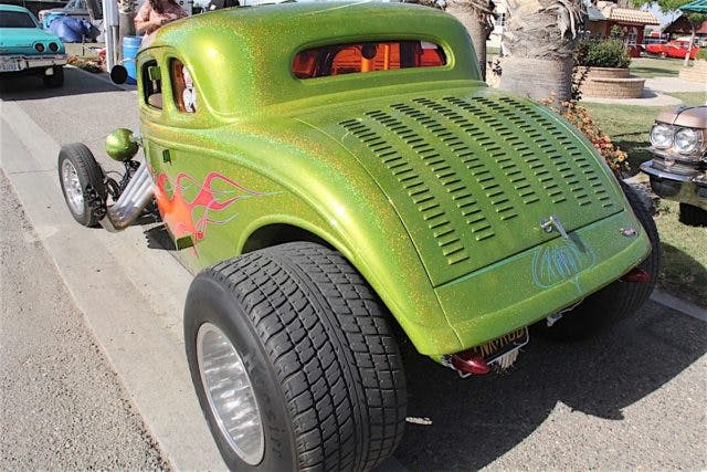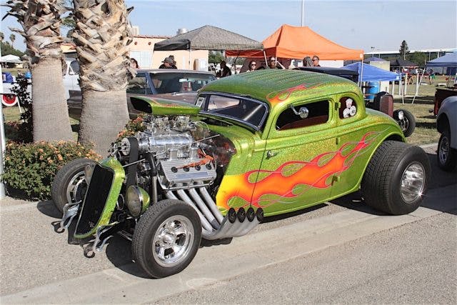 We’ve had a reoccurring dream about one of the very best rods we’ve seen in a long time, that we spotted at the National Street Rod Association’s Western Nationals in Bakersfield, California. It was this green metallic coupe with yellow/red flames, and it has played the role of dream-maker in nightly visits while we sleep.