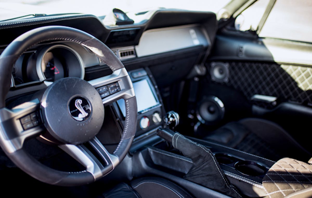 Michael said the car also retains all of its modern suspension geometry in the chassis and that it has been strengthened with welded chassis braces and Steeda coilovers on all four corners, complimented by 15-inch rotors, and six-piston Brembo brakes. Drivers can still utilize ABS, traction and launch control systems that come with the modern Shelby.