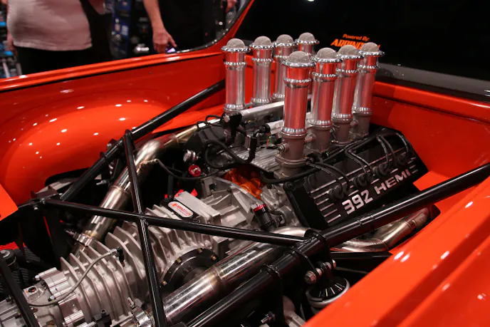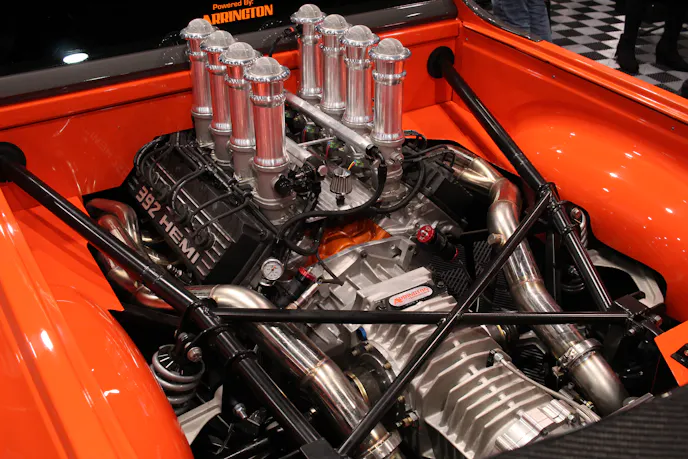 “That let me do a four-inch, all-steel flare that we hand fabricated and welded into the body at all four corners. Then the color – I knew I wanted it bright, and I really like orange – It’s a Hemi, right.” Mike said with a big smile on his face.