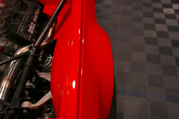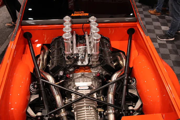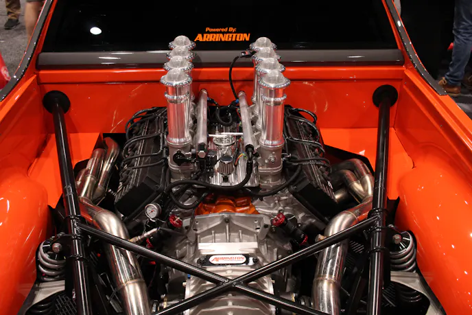 “It’s a mid-engine car now. It’s got a Gen-III Arrington Hemi in it. That includes our CNC Ported heads and camshaft. When people ask, ‘what’s the cam?’. I say, from one to 10 – it’s a 13. So, it’s a big roller. It’s also got Borla stack injection on it, and we run it with a Holley dominator fuel injection system. That’s fed with Aeromotive, and we cool it with Flex-A-lite.”