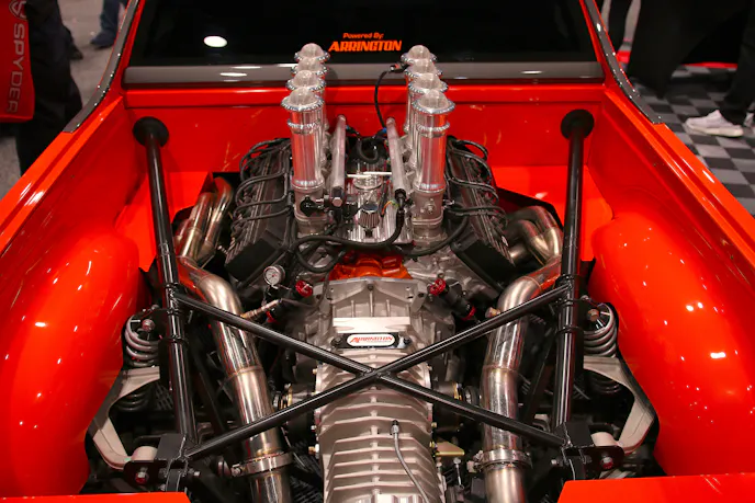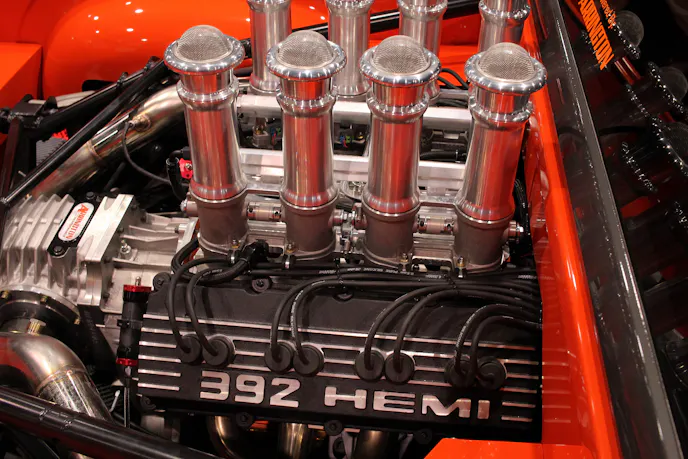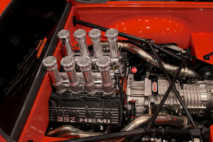 “It’s a mid-engine car now. It’s got a Gen-III Arrington Hemi in it. That includes our CNC Ported heads and camshaft. When people ask, ‘what’s the cam?’. I say, from one to 10 – it’s a 13. So, it’s a big roller. It’s also got Borla stack injection on it, and we run it with a Holley dominator fuel injection system. That’s fed with Aeromotive, and we cool it with Flex-A-lite.”
