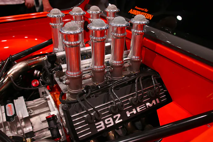 “That let me do a four-inch, all-steel flare that we hand fabricated and welded into the body at all four corners. Then the color – I knew I wanted it bright, and I really like orange – It’s a Hemi, right.” Mike said with a big smile on his face.