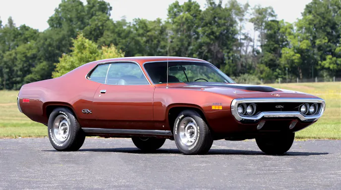 Possessing what Plymouth’s ad department referred to as “Fuselage Styling,” the GTX’s most unforgettable feature was its front end with a bumper that completely surrounded the grille and quad lamps. Lending the car a jet intake look, the fascia led to an lengthy hood, ideal for swallowing up big V8s, and then a greenhouse that featured an interesting trapezoidal shape to the quarter window openings and a ski slope that gracefully led to an extremely short deck.