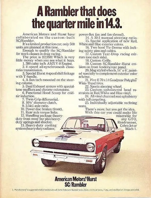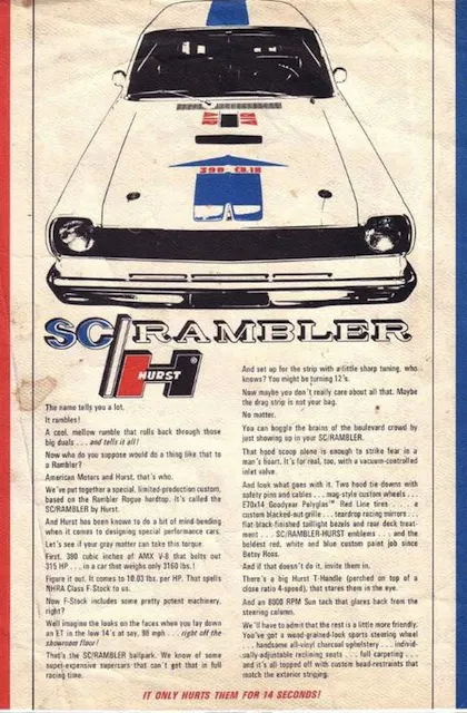 Introduced at the 61st Annual Chicago Auto Show on March 8th, 1969 at a price of $2998, the SC/Rambler promised to make life miserable for any GTO, Road Runner, Cobra Jet or Mach I, according to the ad. “A Rambler that does the quarter mile in 14.3” was enough to catch the attention of enthusiasts everywhere. With some Group 19 equipment, 12s were cake.
