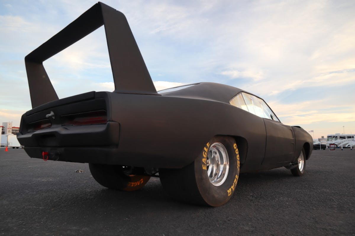 Aside from the sheer size of the Daytona clone, it’s a car that announces its presence with stance. Herb set the body on top of his custom tube chassis with custom suspension, coilovers, and wheels and tires. It rides on the always-classic Weld Drag Stars. The rears are 15×10 to accommodate the 33-inch Goodyear Eagle slicks, and the fronts are 15×4 with Mickey Thompson ET Fronts to complete the raked hot rod look.
