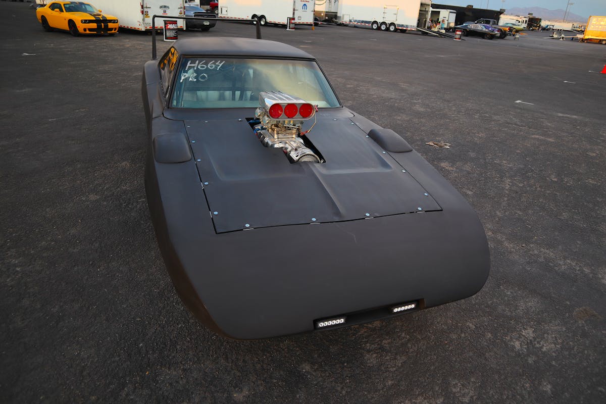 Aside from the sheer size of the Daytona clone, it’s a car that announces its presence with stance. Herb set the body on top of his custom tube chassis with custom suspension, coilovers, and wheels and tires. It rides on the always-classic Weld Drag Stars. The rears are 15×10 to accommodate the 33-inch Goodyear Eagle slicks, and the fronts are 15×4 with Mickey Thompson ET Fronts to complete the raked hot rod look.