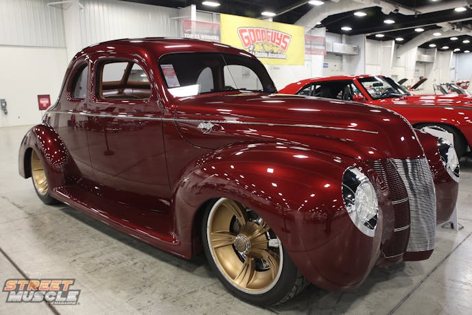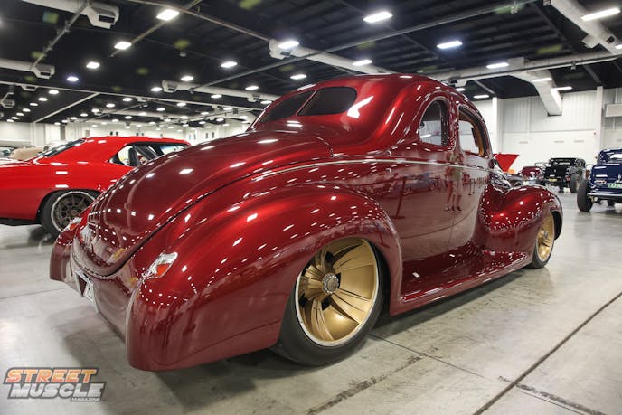 Ron Cizek’s 1940 Ford Coupe has scored several different awards at various Goodguys shows. Cal Automotive Creations built a custom chassis for the coupe that features a one-off independent rear suspension with a custom center section, inboard brakes, brake housings that match the custom Atomic Machine wheels, and much more. A 284 cubic-inch 1952 Mercury flathead mill that’s topped off with a 4-71 supercharger and EFI system powers the Ford. The body has been chopped, wedge-sectioned, and totally worked over so the PPG Cranberry paint laid down by Charley Hutton would look perfect.