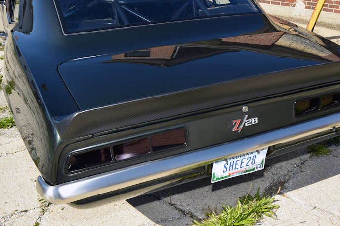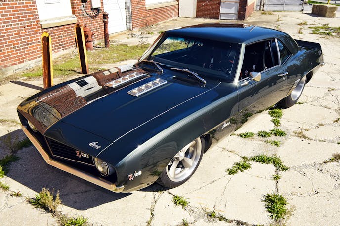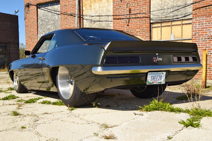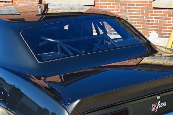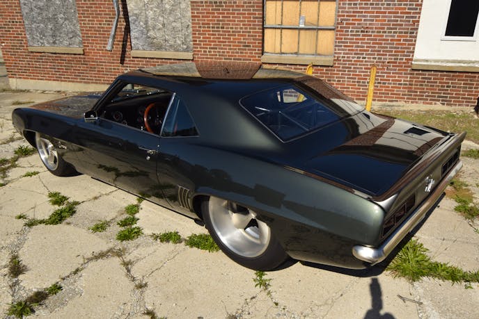 The body shell features a wealth of subtle modifications. The drip rails have been shaved along the roof line. The front and rear bumpers were cut, narrowed, and tucked to the body. The side markers have been shaved, and the overall look is finished out with absolutely no major chrome-plated hardware existing on the general Camaro.
