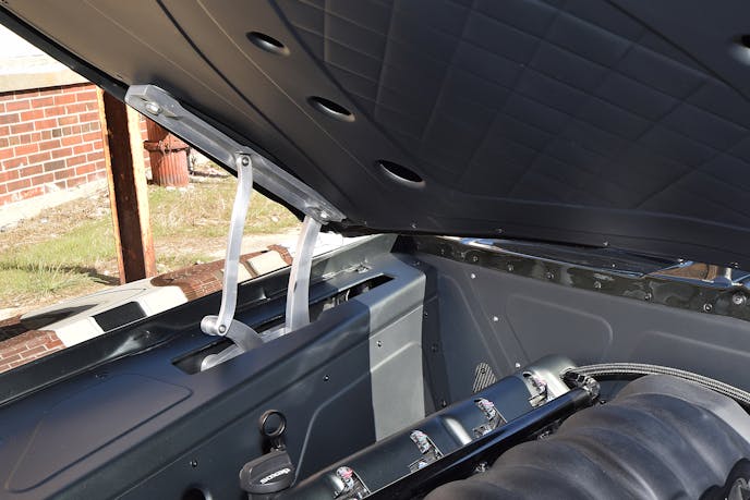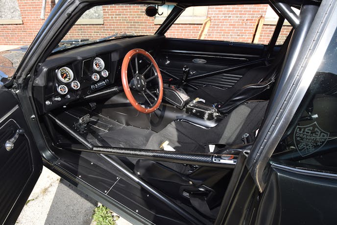 A blend of hardcore racing and original styling make up the interior. Kirkey aluminum seats hold the husband and wife with safety equipment in place, such as DJ Safety harnesses. The factory appearing dash is filled with a wealth of Autometer gauges. Shifting for the overdrive transmission is put into the driver’s hand with a Holley Performance/B&M Pro Ratchet shifter.