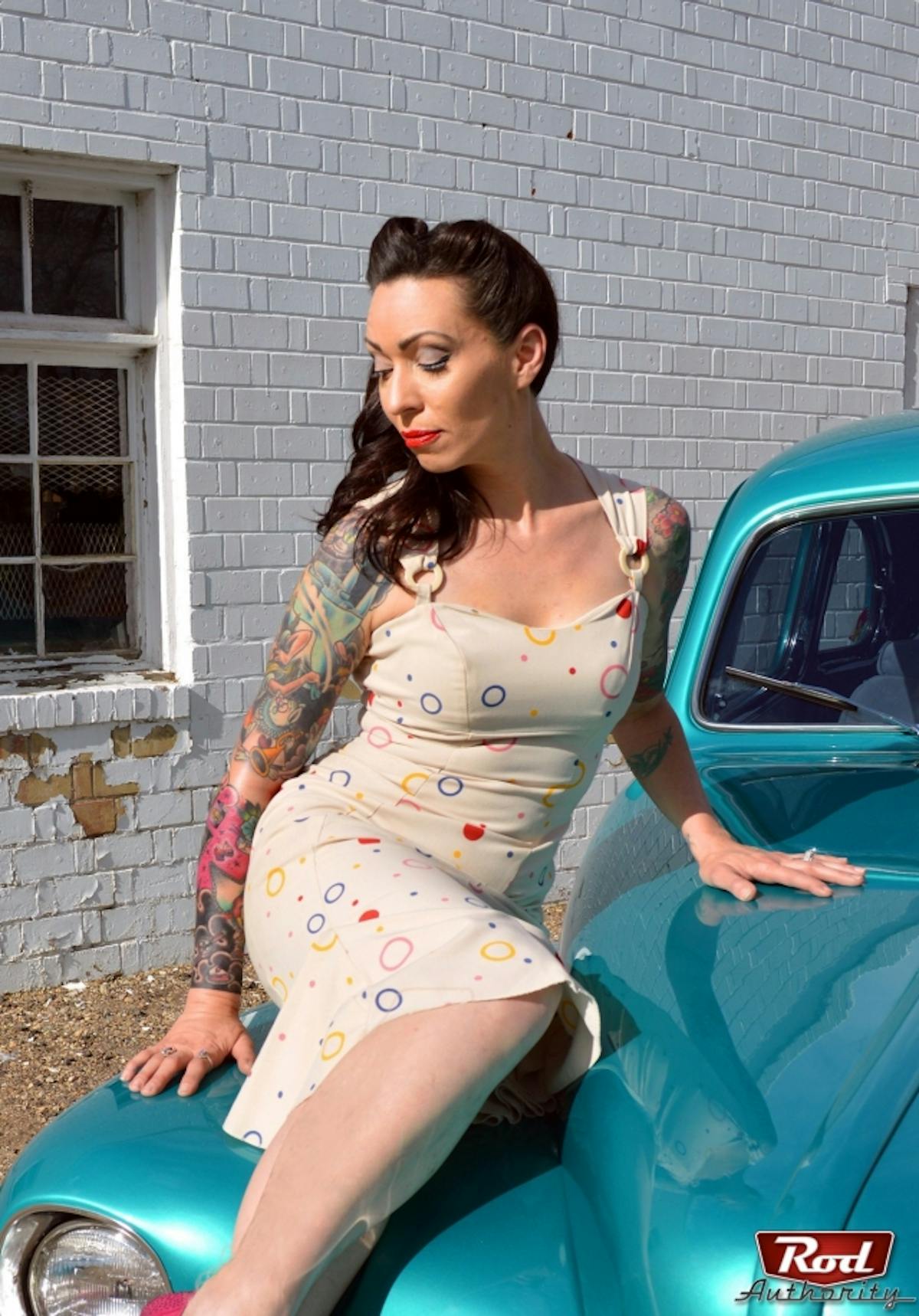 Just like her classic ride, Dolan is a unique beauty with plenty of personality, warmth, and style. With a true passion for everything vintage, including classic pinup styling, Dolan’s collection of classic clothing, from swimsuits to high heels is just about enough to make any hot rod gal envious, while her intricate tattoos not only add more edge to her look, they also tell a lot about who she is and what she is passionate about.