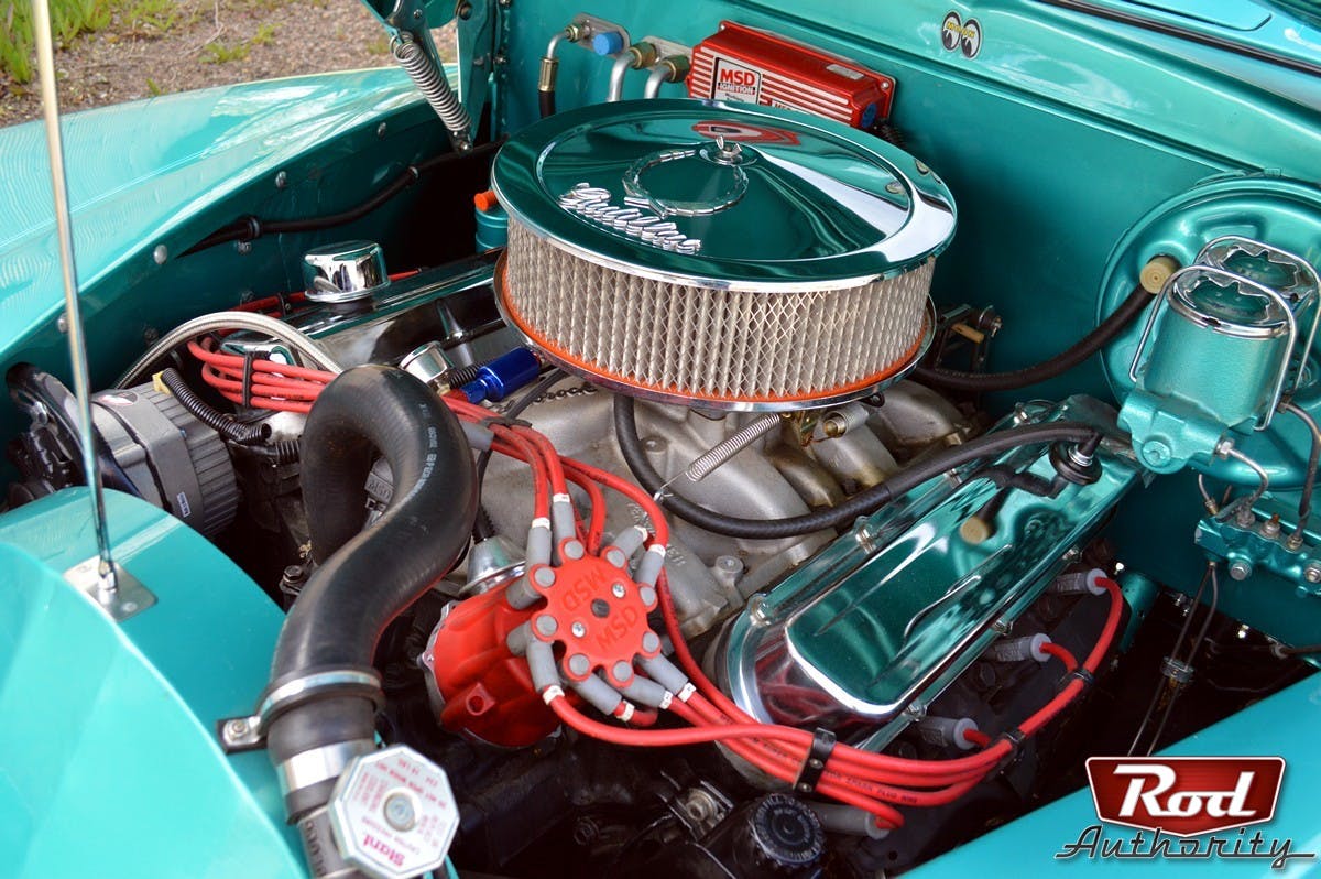 Moving from the aesthetics to the running gear presents an unexpected surprise under the hood–a 500 ci engine borrowed from a 1976 Cadillac Eldorado. Helping trick this bad boy out are a camshaft and roller rocker lifters from COMP Cams, Trick Flow pushrods, an Edelbrock intake manifold and carburetor, MSD ignition and Pro-Billet distributor, and a Flowmaster Delta Flow 50 Series muffler. Miscellaneous additions include electronic cruise control.