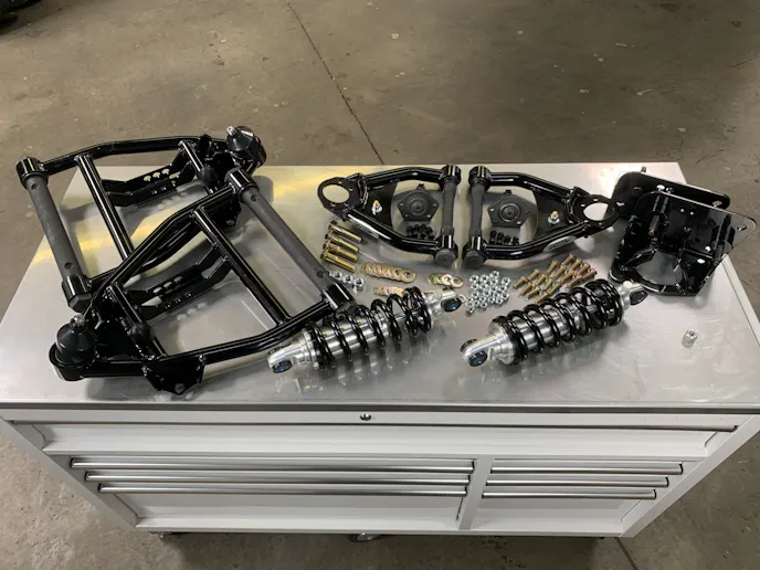 It is comprised of beefy with a capital “B”, tubular control arms, and heavy-duty brackets that attach to the frame using the factory bolt holes for the stock control arm brackets. The only “major” difficulty one might run into when tackling the install in a home garage with hand tools is drilling out the spring pocket to accommodate the coilover pass-through.