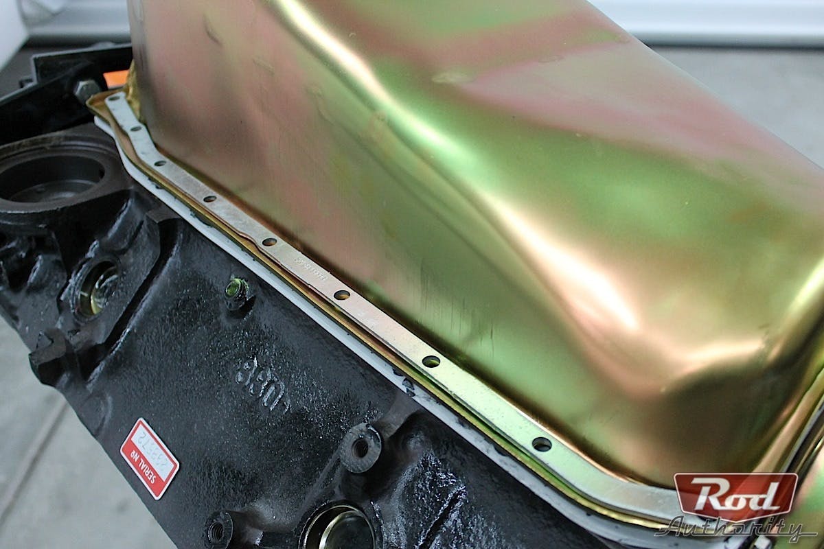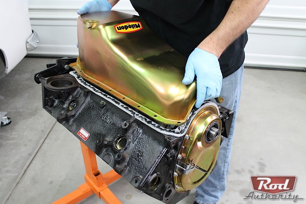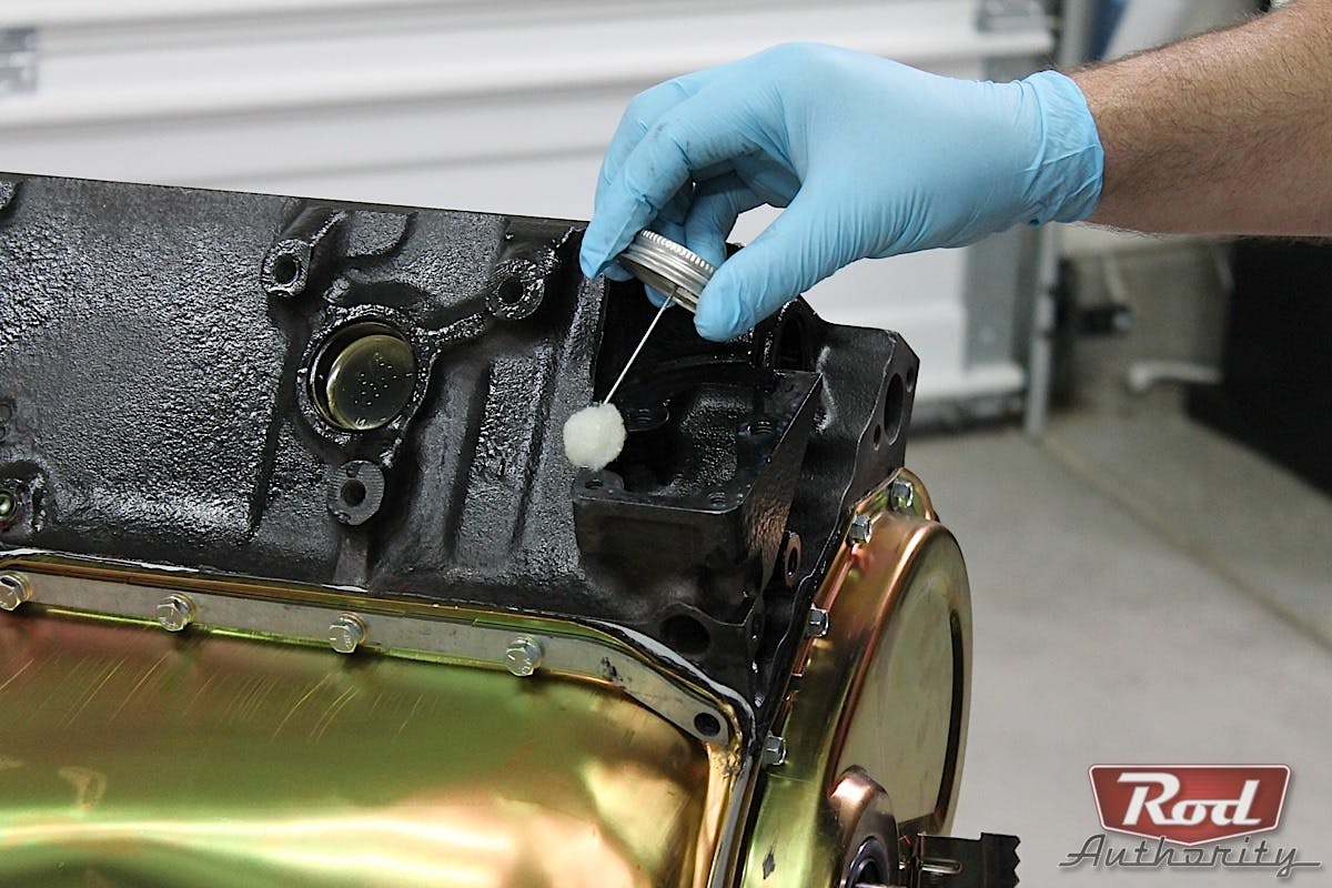 Using a small caulking gun, apply a thin bead of gasket maker to the block’s oil pan mating surface. The four corners of the front and rear main seal should get a thicker bead of gasket maker.