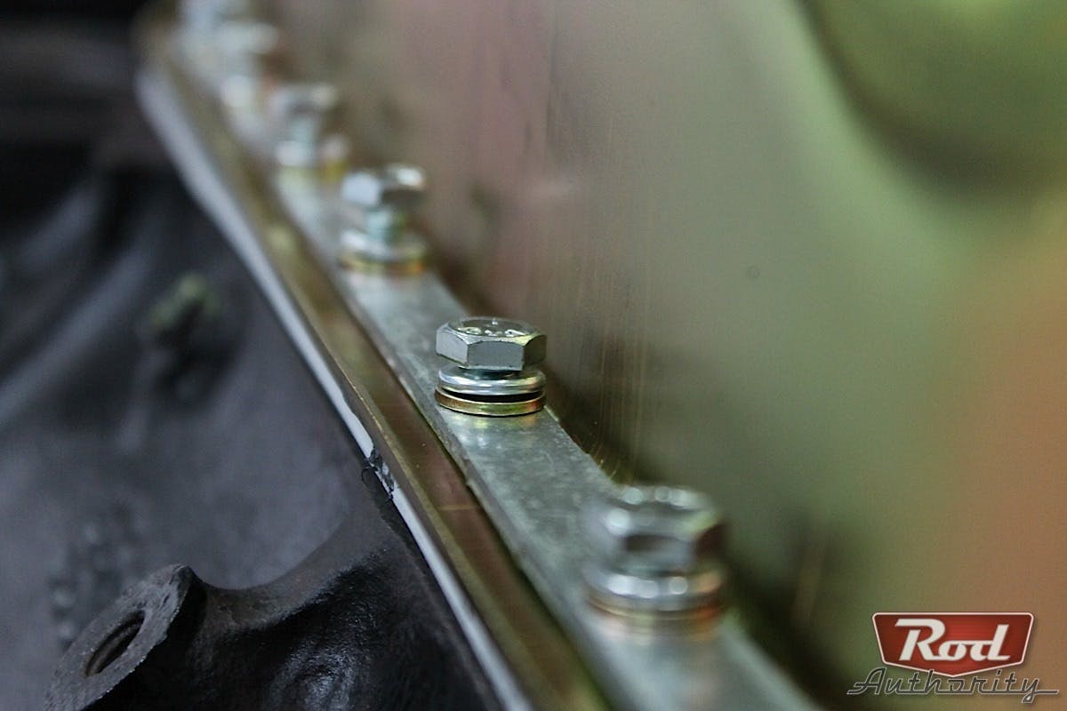 When torquing down the oil pan’s side, front, and rear bolts we made sure to stay within the number stated on Edelbrock’s instruction manual. It is important not to over-tighten these bolts as it will end up squeezing out the gasket and gasket maker.