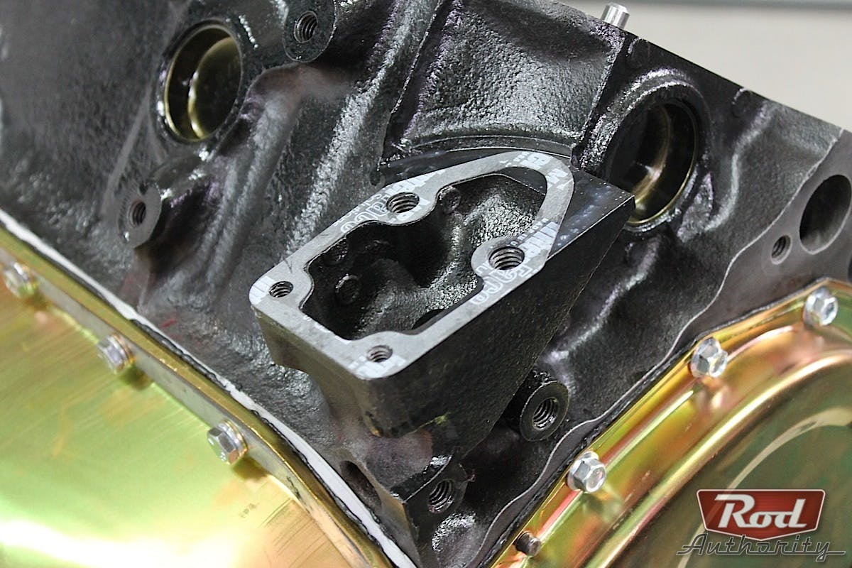 With the timing cover on we flipped our 383 over. We then installed the oil pump assembly and oil pickup torquing it down to the block at 65 ft.-lbs.