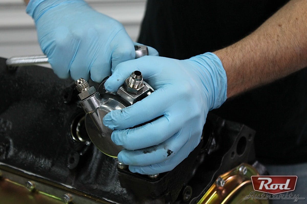 Once that was done we installed the oil filter adapter using two oil filter adaptor bolts torqued to 8 ft.-lbs. After applying a little oil to the gasket of the supplied oil filter we installed it then moved onto the fuel pump.