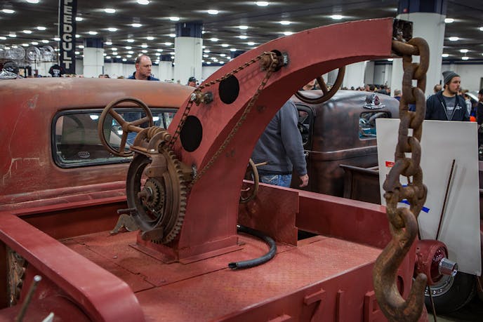 Many of the components used for this mock tow mechanism come from a discarded corn thresher. Randy found the piece of machinery in the woods while deer hunting. As soon as he saw the parts, the gears started turning in his head, and shortly afterwards what you see below came to life. The hook is mounted to a removable section of the bed floor.